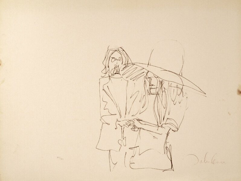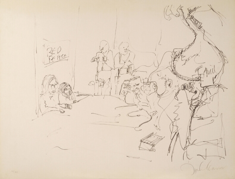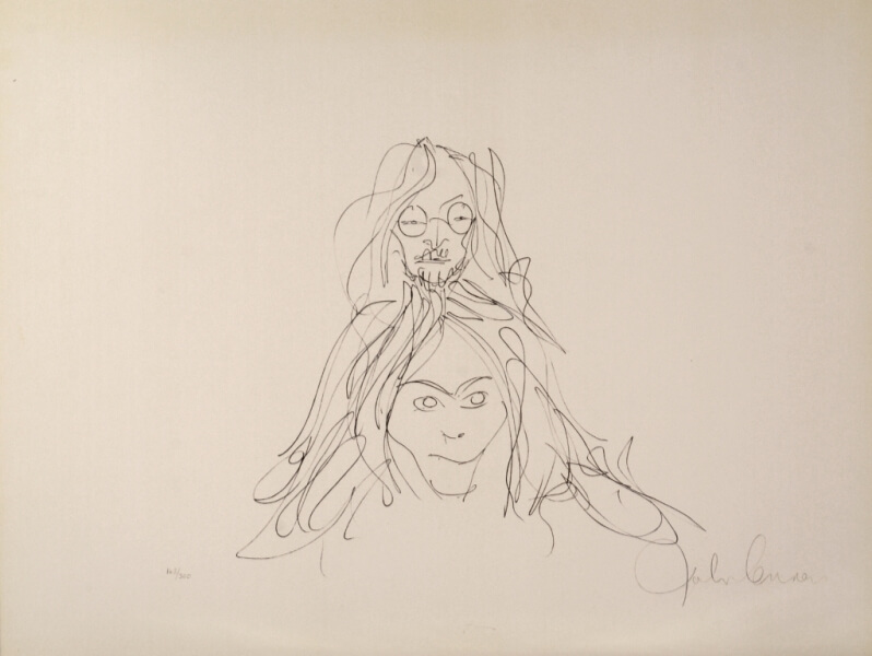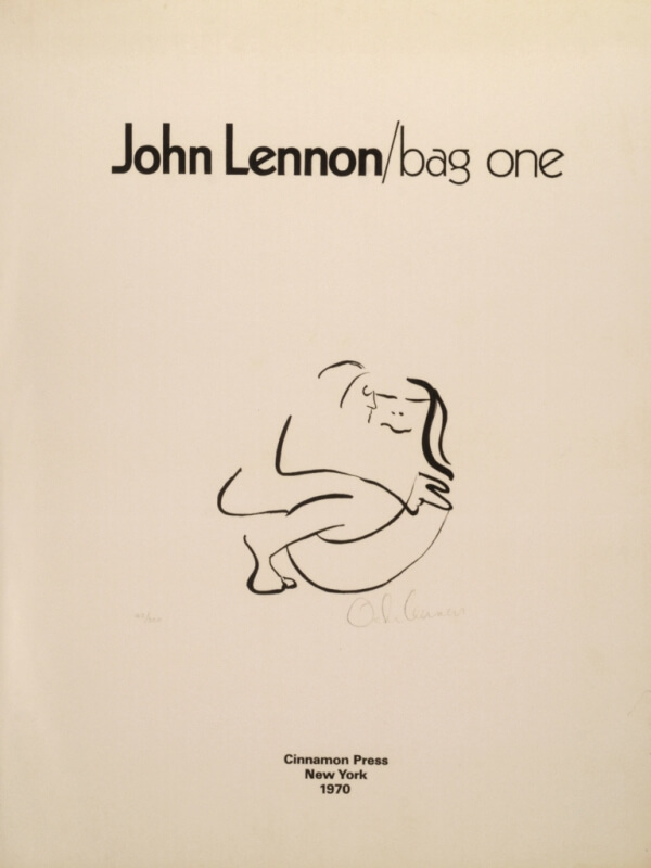 Particolarissima, la cartella di 14 litografie intitolata “Bag One”, pensata da John come regalo di nozze per Yoko nel 1969. Lo scambio degli anelli, il celebre bed-in per la pace di Amsterdam, la luna di miele, momenti della loro intimità, sono i soggetti scelti da Lennon per questa serie di immagini caratterizzate da un tratto fresco, agile, ironico. “Bag One” venne esposta per la prima volta il 15 gennaio 1970 alla London Arts Gallery e immediatamente sequestrata da Scotland Yard per l’alto tasso di erotismo di cui erano permeate le stampe.