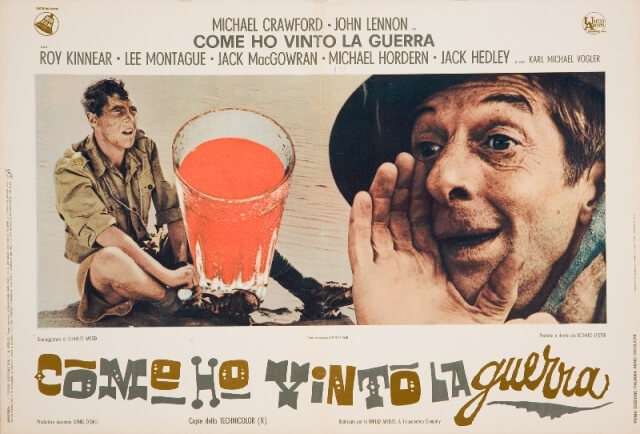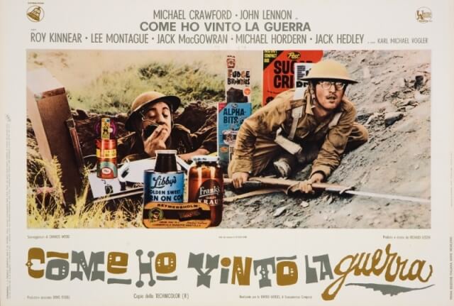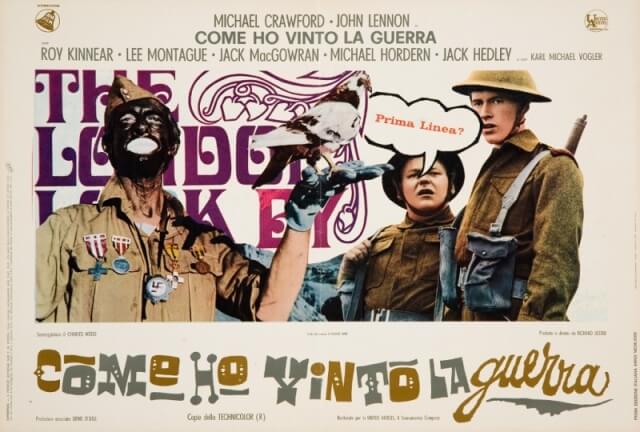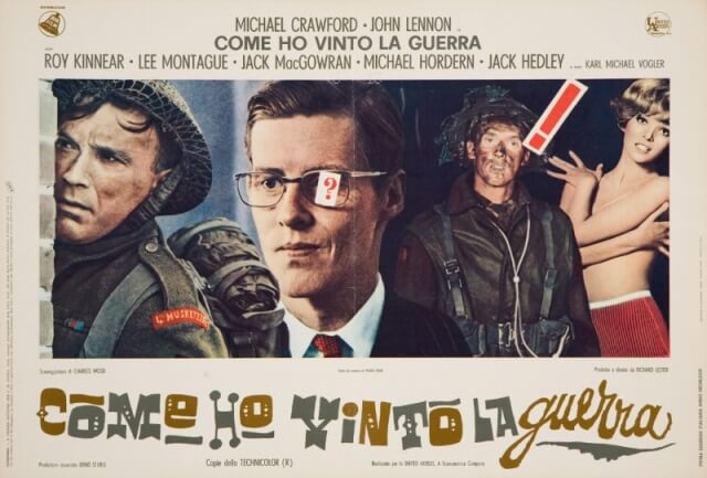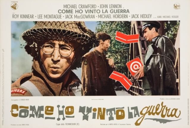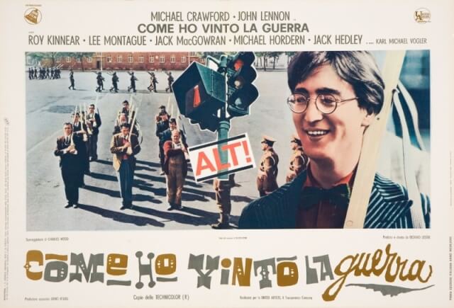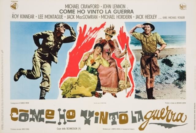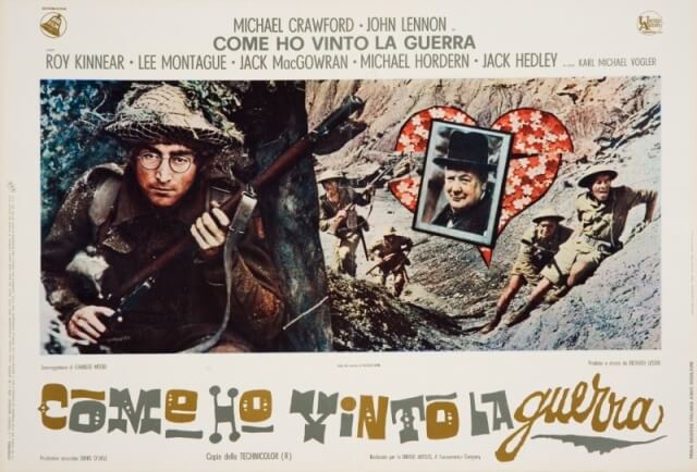 Se si escludono “A Hard Day’s Night”, “Help!” e “Magical Mystery Tour”, realizzati assieme agli altri tre Beatles, la commedia satirica e antimilitarista “Come ho vinto la guerra” (1967) di Richard Lester rimane l’unico film interpretato da Lennon, qui nei panni del soldato semplice Gripweed. John vi compare per la prima volta con gli occhiali tondi, look che rimarrà iconico per tutti gli anni a venire. Del film sono in mostra tutte le locandine e i manifesti realizzati con effervescente fantasia grafica per il suo lancio in Italia, nonché altri materiali iconografici ed editoriali ad esso dedicati.