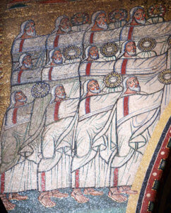 Al di fuori delle due porte della città (guardate da due angeli) si trovano gli eletti, in attesa di entrare nelle mura. Così descrive la scena Giacomo Fontana, autore dell’opera I Mosaici di Roma, pubblicata nel 1870:
