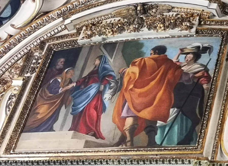 Si dedica infine alla volta della cappella dove dipinge un Dio Padre michelangiolesco (al centro) circondato da quattro tondi con angeli musicanti e quattro scene mariane. Partendo da sinistra e muovendosi in senso orario: Nascita della Vergine, Presentazione al Tempio, Annunciazione, Assunzione. Nel trionfo degli stucchi bianchi e oro, certamente una volta pregevole.